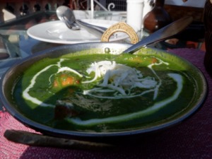 サードアイで食べたパラクパニールは、鮮やかな緑色をしていました。