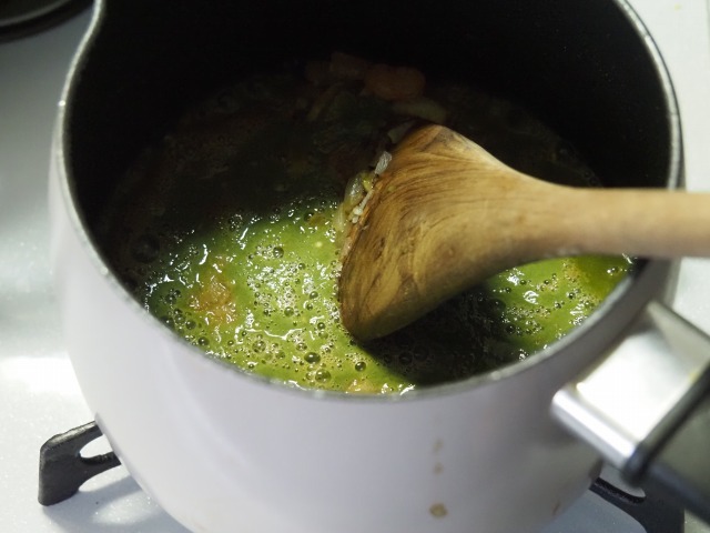 こういうカレーはパラクパニールというのですが、具材を煮る時にほうれん草ペーストを入れると、カレーの色が緑になります。