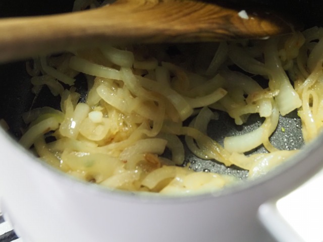 油を熱してタマネギやニンニク、クミンを炒めます。