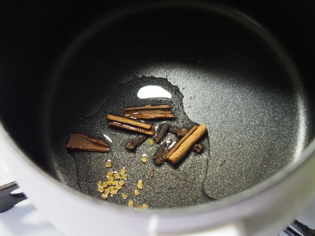 最初に炒めるスパイスとして、私がお勧めするのは、シナモン・クローブ・カルダモン・フェヌグリークシードです。