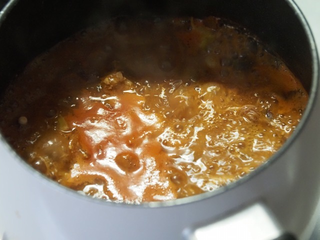 トマトは入れておきたいところですが、生野菜は高いし面倒なので、缶詰か無塩のトマトジュースを使うのが簡単です。
