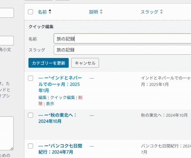 カテゴリーは一括編集できないので、クイック編集を押し、何も変更せずに「カテゴリーを更新」を押します。