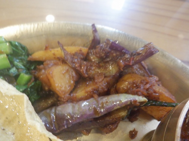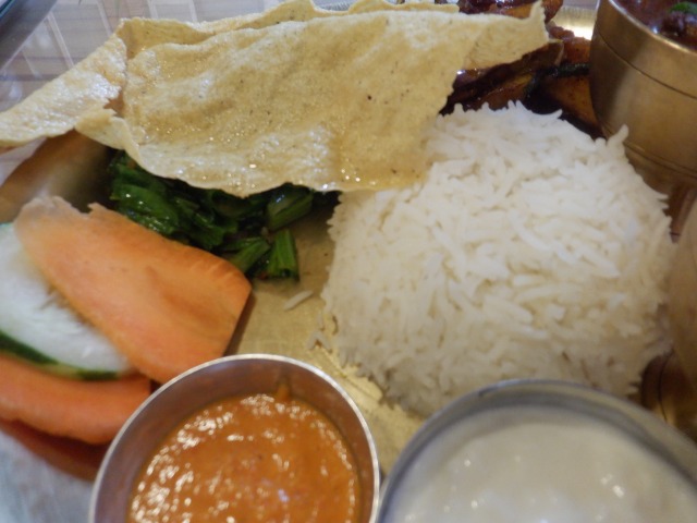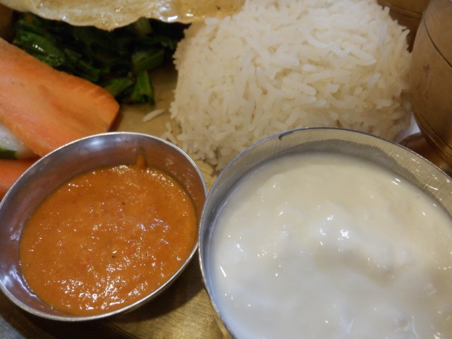 ダルバートは、周りのカレーや付け合わせを、ライスにかけながら食べていく。