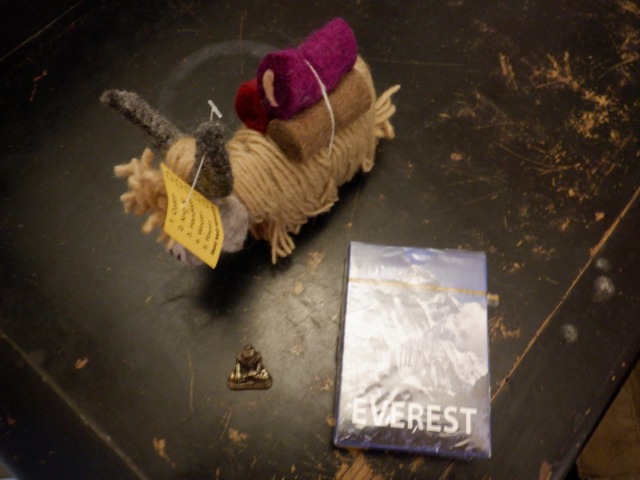 下にあるのは、金属製の小さいブッダ座像と、エベレストのトランプである。