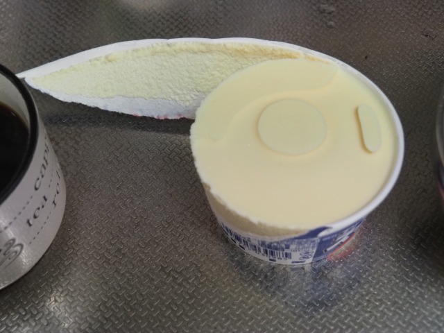 スーパーカップの入れ物に、ハサミで切れ込みを入れ、周りを剥がしていく。