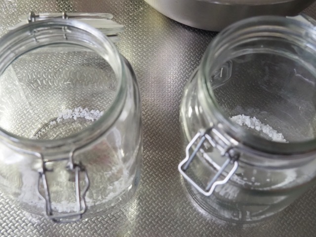 ビンの底に塩を敷き、そこに味噌を入れていく。
