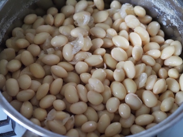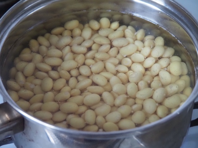 最初に入れた水だけだと、豆が水から出るくらい、豆に水分を吸われてしまったので、後からさらに水を足してある。