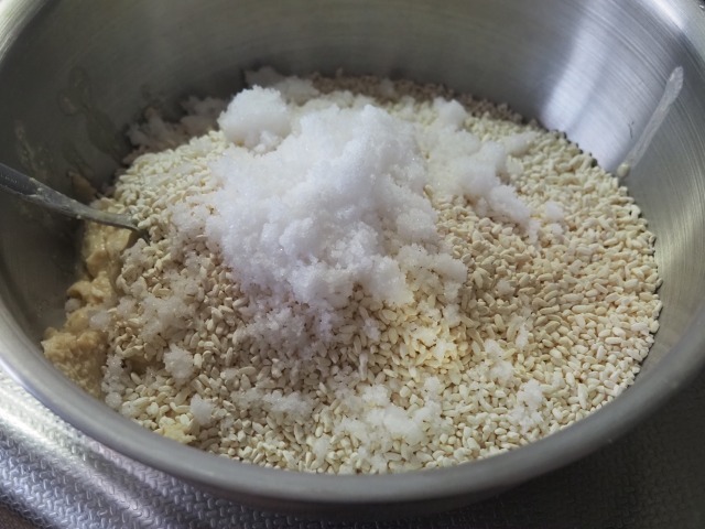 大豆、麹、塩をよく混ぜたら、後はビンに詰めて保存するだけ。