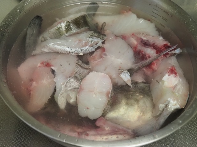 本に従い、内臓や切り身を水に浸けて、しばらく血抜きする。
