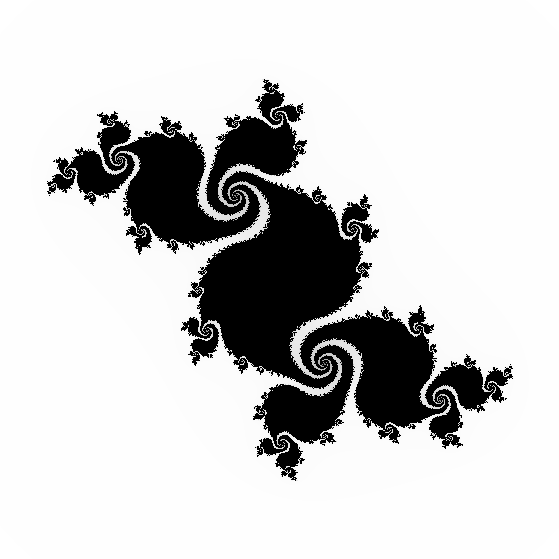 発散する場合と発散しない場合で色を塗り分け、さらに、発散する速度の違いでもグラデーションを付けると、冒頭のようなジュリア集合を描くことができます。